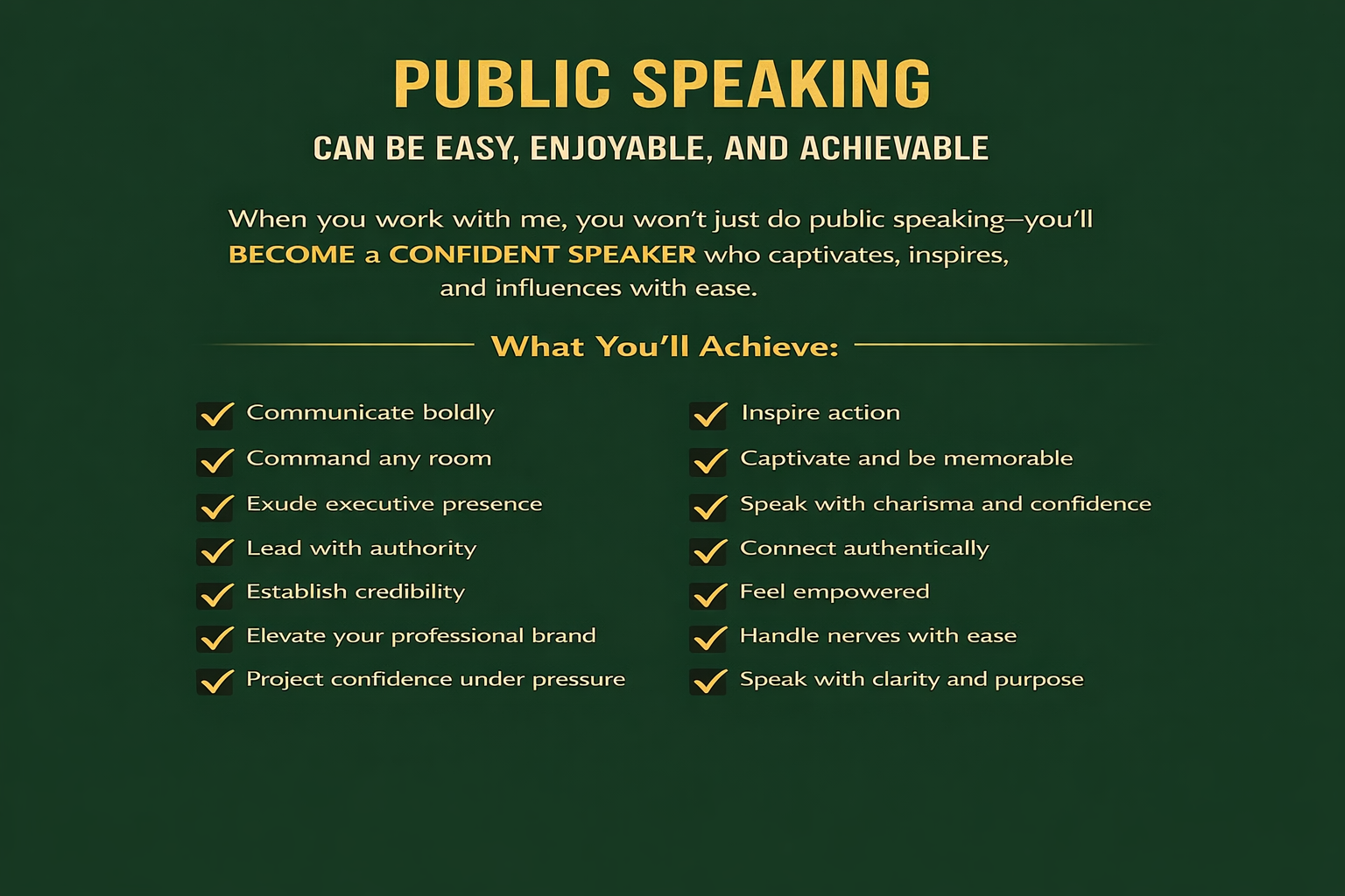 If you’re here, you already know your ability to speak with clarity and confidence is directly tied to your success in corporate life—your influence, your impact, your income, and your advancement.